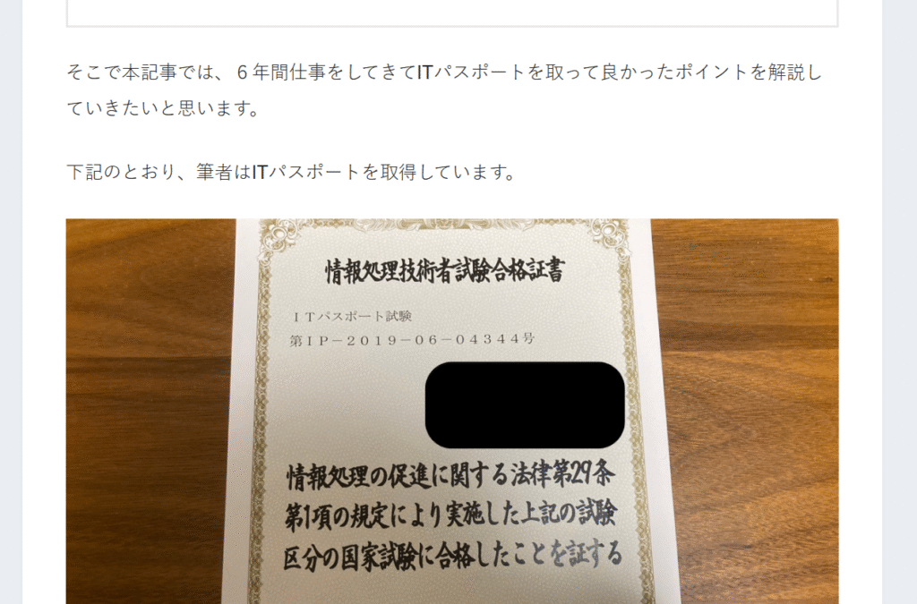 例えばITパスポートに合格してよかったことと合格するには?の記事では、記事の序盤に合格証書の画像を添付しました。